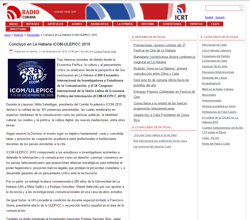 Tras intensas jornadas de debate donde la Economía Política, la cultura y el pensamiento crítico se analizaron desde la perspectiva del Sur, concluyeron en La Habana el VIII Encuentro Internacional de Investigadores y Estudiosos de la Comunicación, y el IX Congreso Internacional de la Unión Latina de Economía Política del Información (ICOM-ULEPICC 2015).
