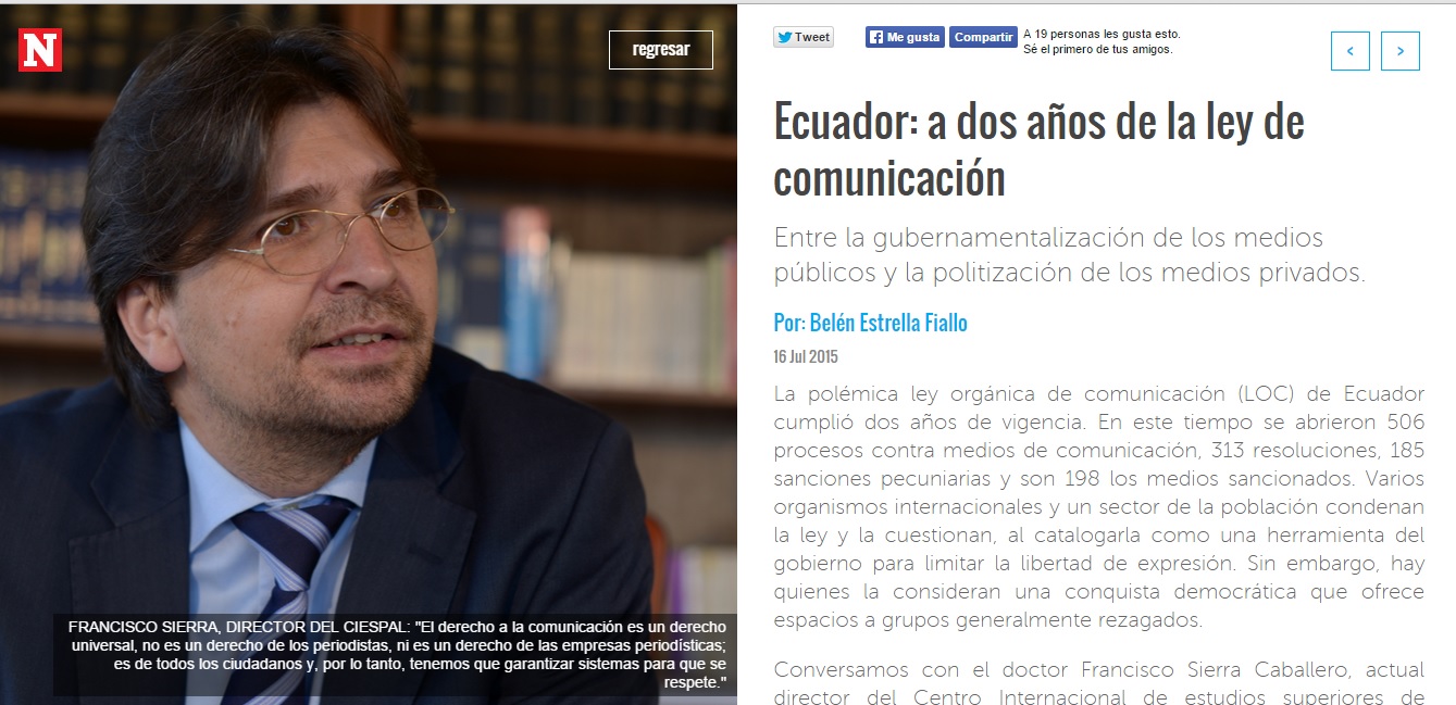 Sierra Caballero acaba de cumplir un año al frente de CIESPAL y su gestión en tan poco tiempo ya se nota al haberle impreso dinamismo a este centro de pensamiento dedicado a la investigación comunicacional, convirtiéndolo en un referente en la contribución y enriquecimiento del proceso latinoamericano que apunta a democratizar el acceso ciudadano a los medios, cuya propiedad tan concentrada, es una característica de los países del hemisferio.
